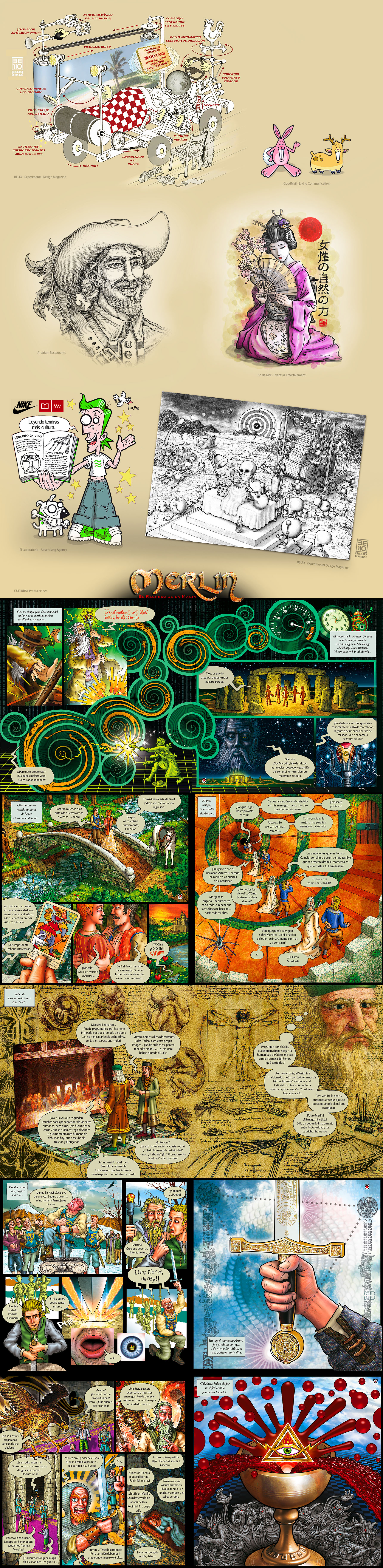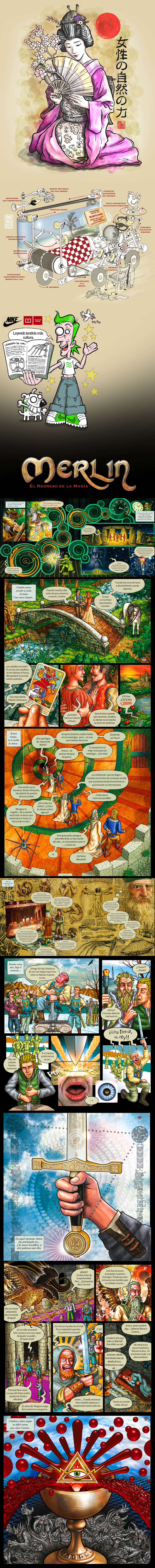 22 double color pages comic with mixed technique illustration, based on the Arthurian legends. Manual inking execution, digital coloring, bullets and texts layout… Adapted to the script delivered by the client.