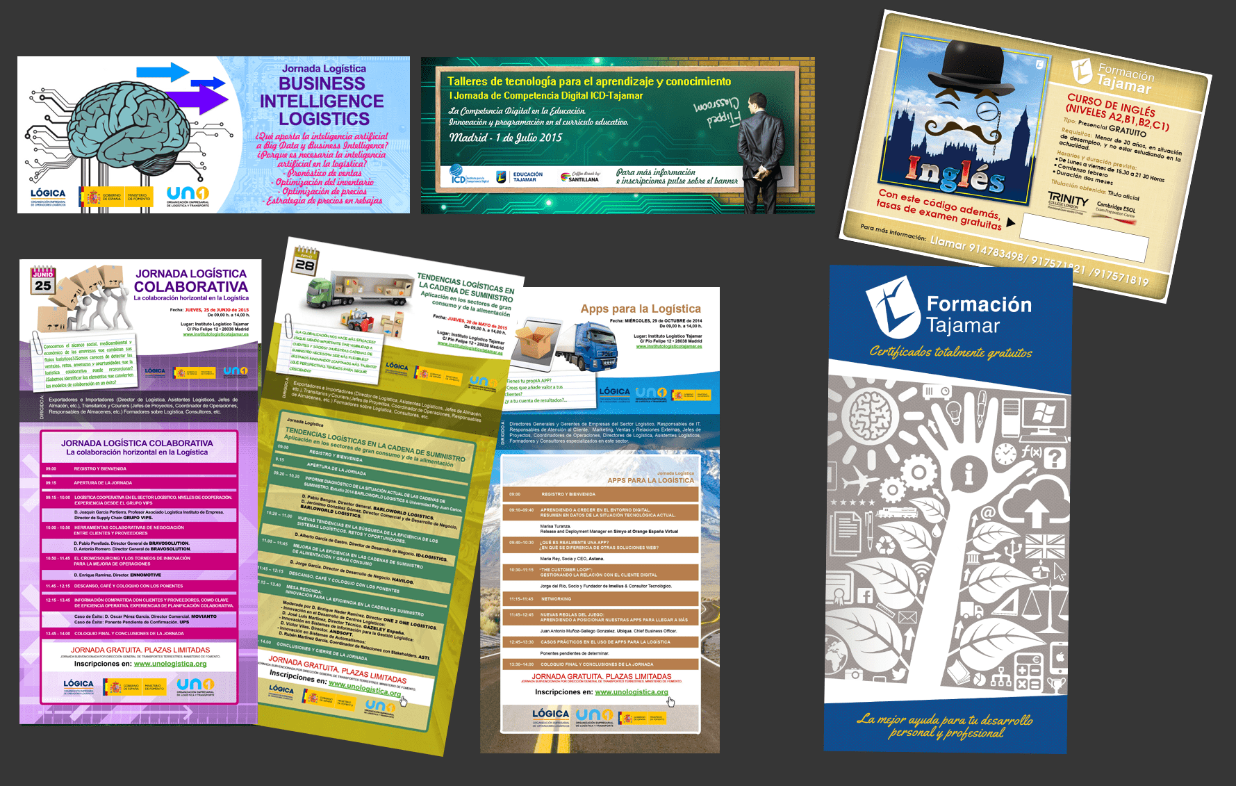 Tajamar: Amplio servicio de diseño de identidad visual corporativa para las 3 ramas de negocio de la institución (Educación, Formación e Instituto Logístico Tajamar). Diseño web unificado, mejora y maquetación de contenidos para 15+ cursos de formación online con integración en la plataforma Exelearning, diseño de carátulas de todos sus cursos de formación.